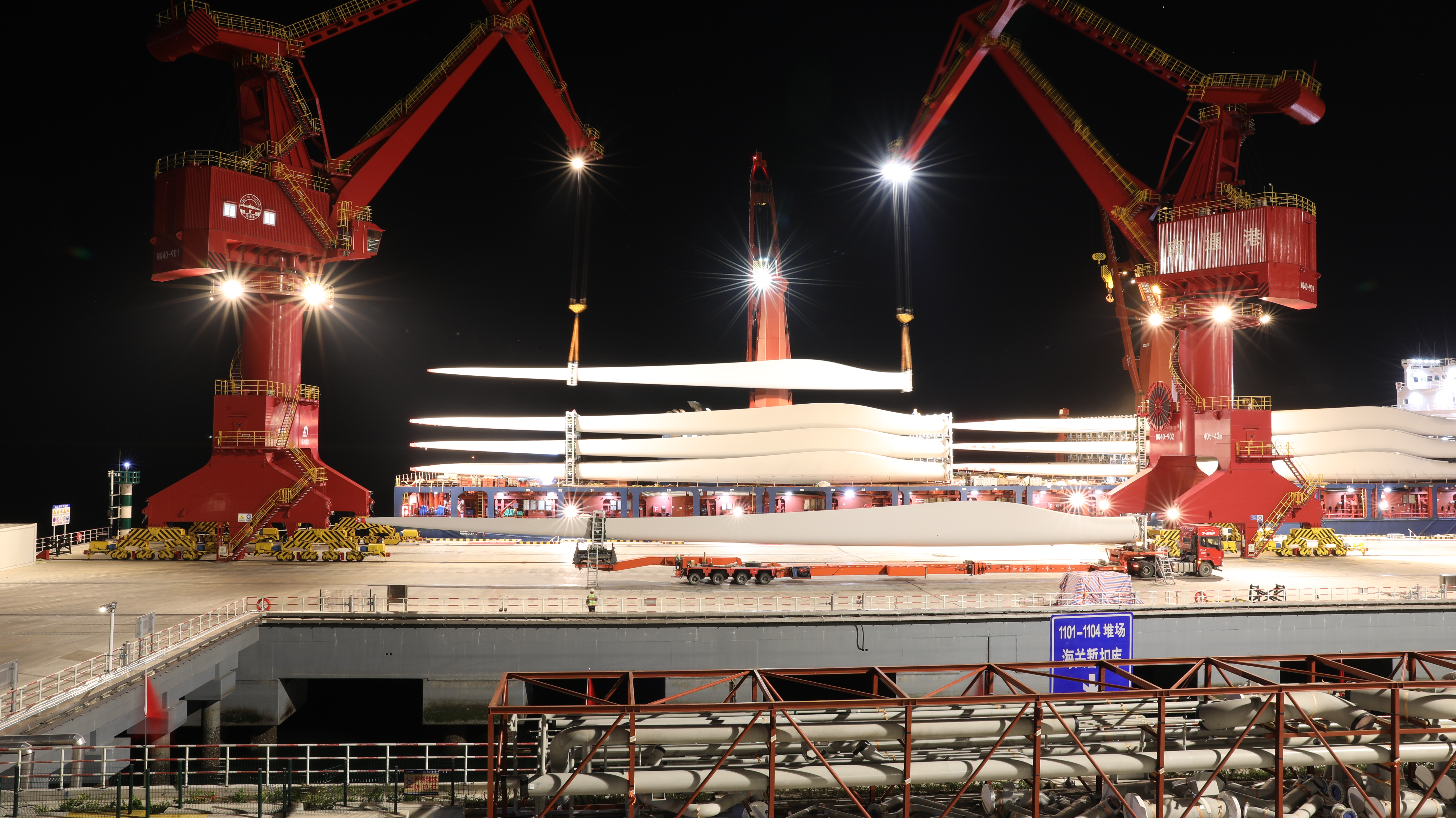 10月28日15時(shí),公司11#泊位剛送走滿載遠(yuǎn)航美洲的“羅納河”輪,又迎來了開港以來風(fēng)電葉片單船裝載量最多的“極速”輪。該輪將裝載111片V110型號(hào)、8.12萬立方、價(jià)值超過7千萬元的風(fēng)電葉片出口歐洲。為提高海輪作業(yè)效率,公司聚焦客戶需求,對(duì)貨物集并、場(chǎng)地安排等精心準(zhǔn)備,并加強(qiáng)內(nèi)外部的協(xié)同配合,選派經(jīng)驗(yàn)豐富的精干力量組成國(guó)際航行船舶作業(yè)專班。同時(shí),公司以技術(shù)創(chuàng)新為抓手,多維度助力生產(chǎn)需求。經(jīng)多次論證、實(shí)地試驗(yàn)和完善優(yōu)化門機(jī)照明系統(tǒng),有效解決了夜間作業(yè)照度不夠、視線不清、定位困難等堵點(diǎn),開啟了風(fēng)電葉片夜間作業(yè)“新模式”,打破風(fēng)電葉片只有白天作業(yè)的“舊常規(guī)”。