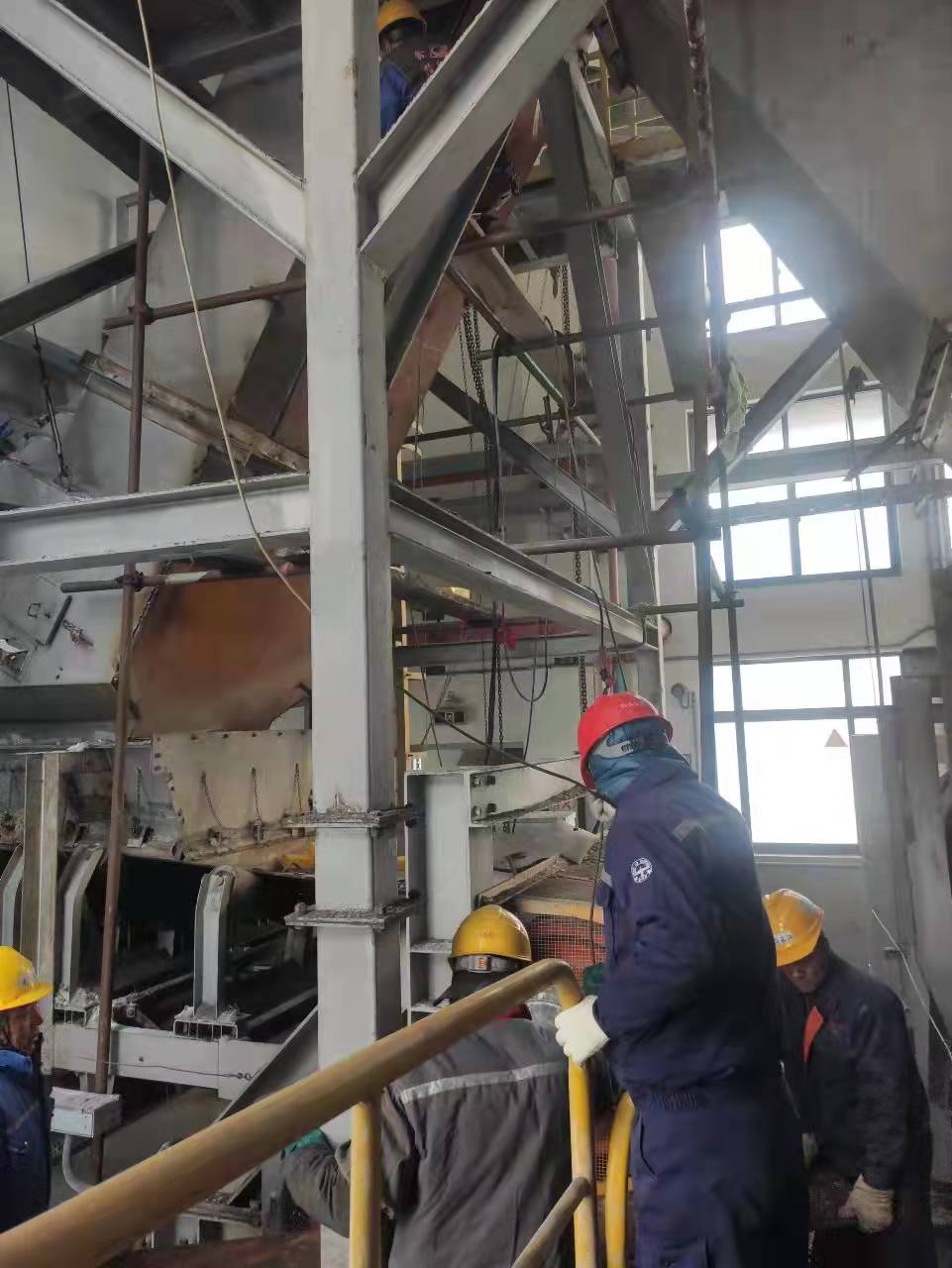 在石英砂作業(yè)過程中,由于料斗和溜筒壁磨損過大,會出現(xiàn)貨物撒漏的現(xiàn)象,需要及時對轉(zhuǎn)運站料斗和溜筒壁更換耐磨鋼板,同時,需要對改向滾筒進(jìn)行包膠。包膠是一件耗時又費力的事,按照一般技術(shù)操作要求,必須要先把滾筒拆下,送到廠家進(jìn)行包膠,然后再運回來進(jìn)行安裝。從拆到安裝最快需要一周的時間。為順利完成生產(chǎn)工藝設(shè)備設(shè)施保養(yǎng)維護工作,公司技術(shù)管理人員放棄休息時間,成立攻關(guān)小組,通過查閱相關(guān)資料、反復(fù)研究探討,最終確定直接在作業(yè)現(xiàn)場進(jìn)行包膠的方案。在生產(chǎn)廠家的協(xié)助指導(dǎo)下,僅僅用了兩天時間就完成了滾筒的包膠,為生產(chǎn)作業(yè)搶得了更多的時間。