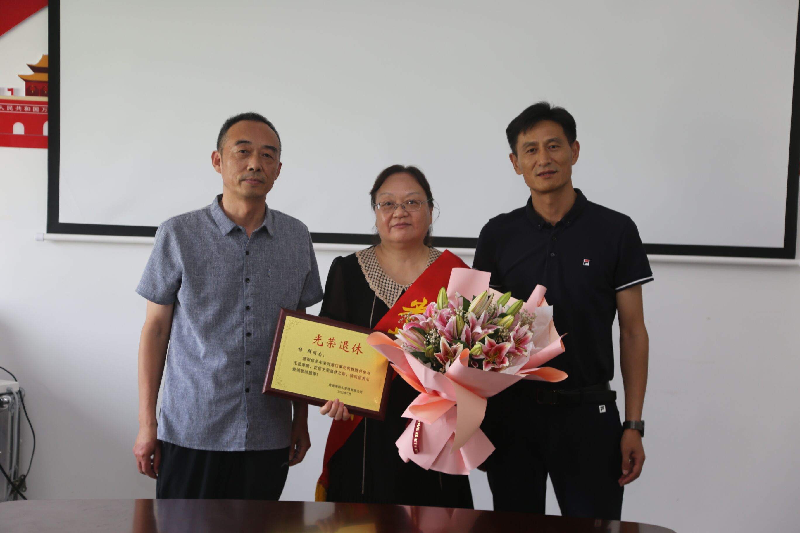 為進(jìn)一步增強(qiáng)職工的榮譽(yù)感、歸屬感和幸福感,7月19日下午,碼頭管理公司為退休職工舉辦榮譽(yù)退休儀式。公司黨委副書記、總經(jīng)理任曉建,公司黨委副書記、紀(jì)委書記、工會(huì)主席金建東出席活動(dòng),公司各部門職工代表等10余人參加活動(dòng)。