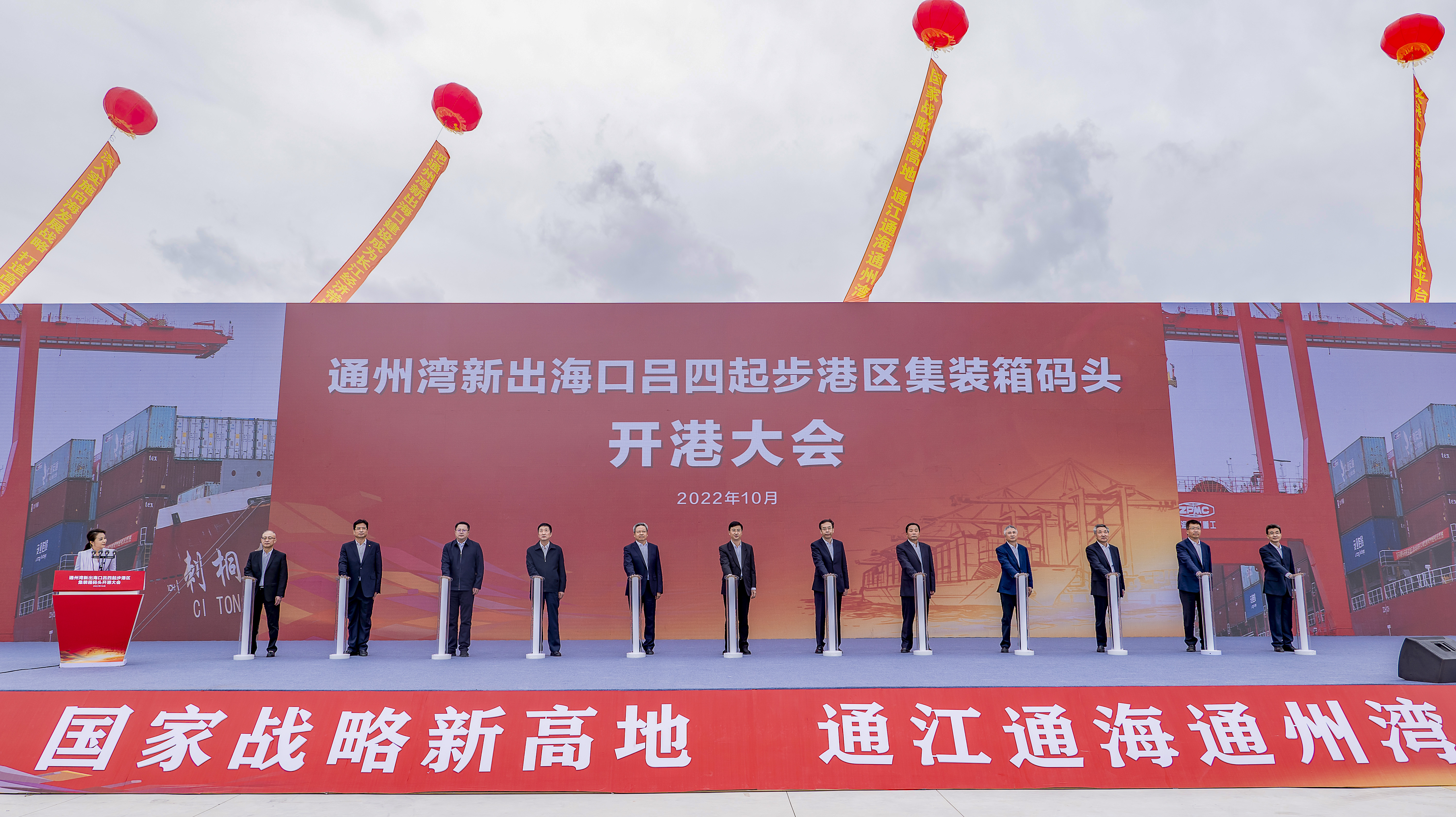 通州灣新出??趨嗡钠鸩礁蹍^(qū)是建設(shè)“一帶一路”對外開放新門戶、長江經(jīng)濟(jì)帶江海聯(lián)運(yùn)新樞紐、江蘇沿海高質(zhì)量發(fā)展新樣板的重大標(biāo)志性工程。本次開港的起步港區(qū)8#-9#泊位是南通港首批建成的兩座10萬噸級現(xiàn)代化集裝箱碼頭,也是全省首個采用5G新技術(shù)實(shí)現(xiàn)港區(qū)全自動化作業(yè)的集裝箱港區(qū),設(shè)計年通過能力140萬標(biāo)箱。碼頭的建成開港,標(biāo)志著南通港集裝箱運(yùn)輸事業(yè)迎來了由江及海的歷史性飛躍。開港后,碼頭將由上港集團(tuán)、省港口集團(tuán)和南通港口集團(tuán)合資組建的江蘇滬通集裝箱碼頭有限公司負(fù)責(zé)運(yùn)營,助力南通加快建設(shè)上海國際航運(yùn)中心北翼江海組合強(qiáng)港。